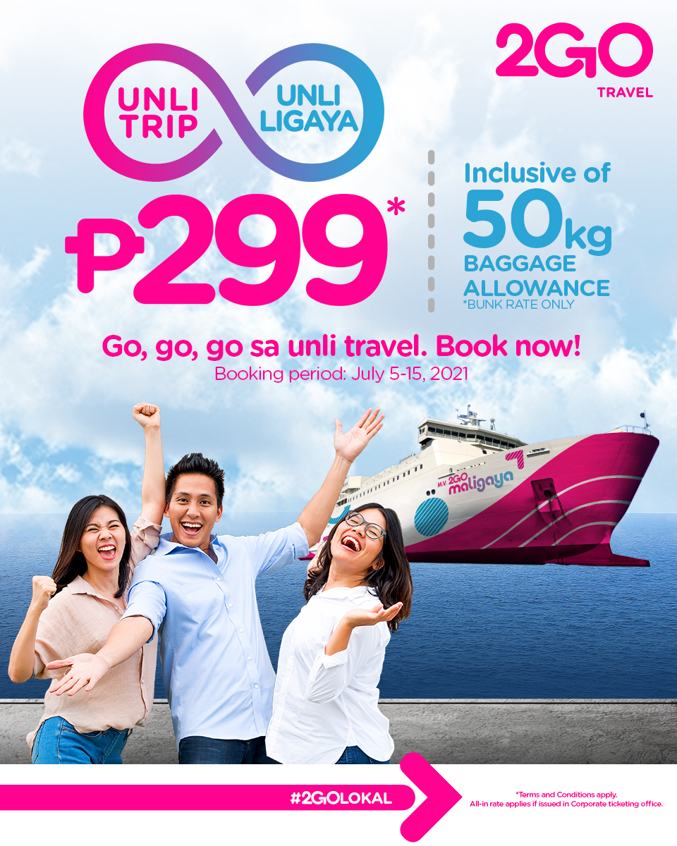 Starting today until July 15, 2021, passengers can avail Unli-Trip tickets for sailing from September 1 to December 31, 2021. The all-in rate of ₱1,059 with a base fare of ₱299 is applicable to Super Value Class and Tatami accommodations, inclusive of 50kg baggage allowance, surcharge, insurance, and exclusive of meals. Passengers can book their travel tickets in all 2GO retail outlets nationwide. Meanwhile, a service fee is charged on top of the rate when tickets are bought from authorized agents.