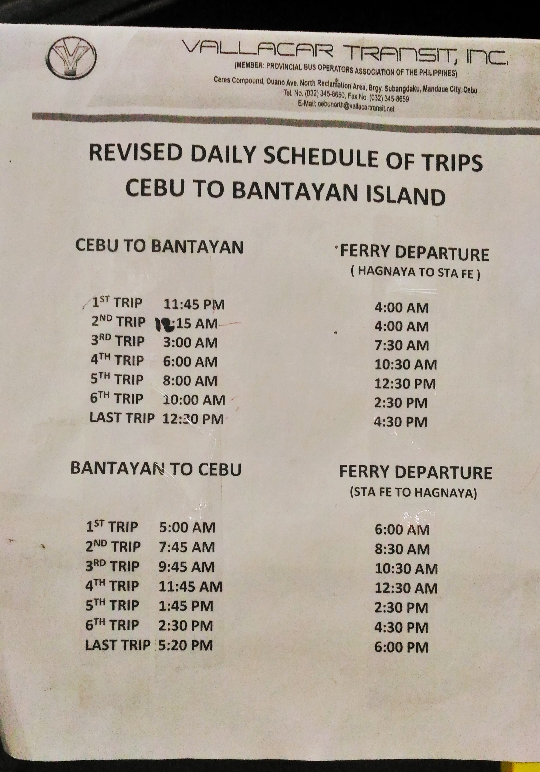 Buses in Hagnaya are available anytime. The schedule chart is for buses leaving straight from Bantayan Island. Last trip is 5pm and it will normally arrive in Sta Fe at 5.30pm from the main town of Bantayan. You can ride the bus at the port itself in Sta.Fe after buying your ferry tickets.